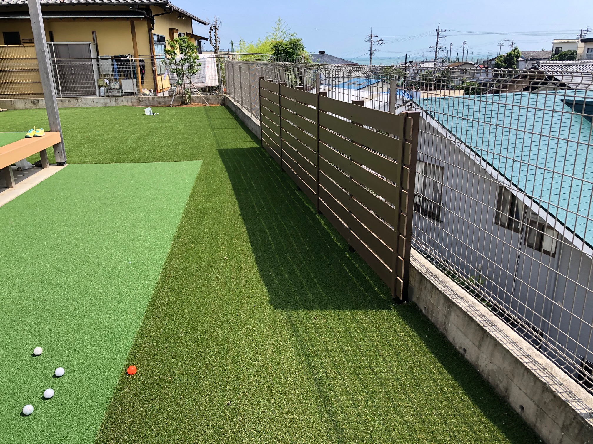 お子様がサッカーの出来るように人工芝にしました。一部ご要望がありパター練習が出来るように、ゴルフ用の人工芝にしました。